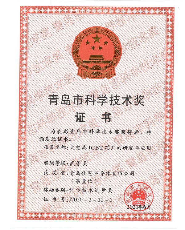 In June 2021, the "R&D and Application of High-Current IGBT Chips" project of Qingdao Jiaen Semiconductor Co., Ltd. won the "Second Prize" of Qingdao Science and Technology. The Qingdao Municipal People's Government issued a special award to encourage it.