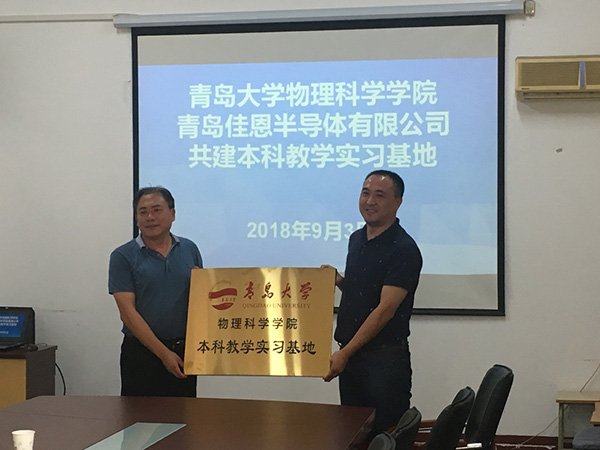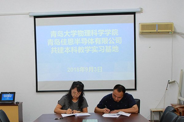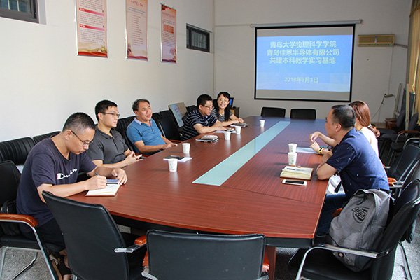 On the morning of September 3, 2018, Qingdao Jiaen Semiconductor Co., Ltd. and the School of Physical Science of Qingdao University held a school-enterprise integration event in Conference Room 401 of Boyi Building. Wang Pilong, general manager of the company, Huang Guojun, secretary of the party committee of the School of Physical Sciences, Teng Bing, dean, Zhou Zhiqiang, deputy secretary of the party committee, and other relevant personnel from both parties attended the event.