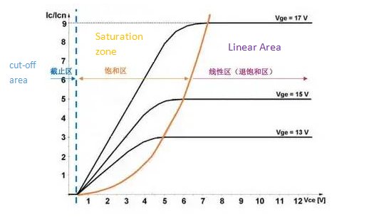 After the voltage between CE is greater than the threshold voltage, the current starts to flow, and the voltage between CE increases linearly with the rise of the collector current. This region is called the saturation region. Because the IGBT saturation voltage is low, we hope that the IGBT works in the saturation region.